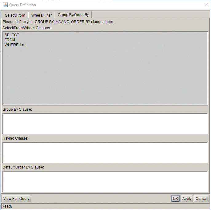 4. (Optional) Click View Full Query to see the entire SQL query—the composite of the information from each of the tabs.