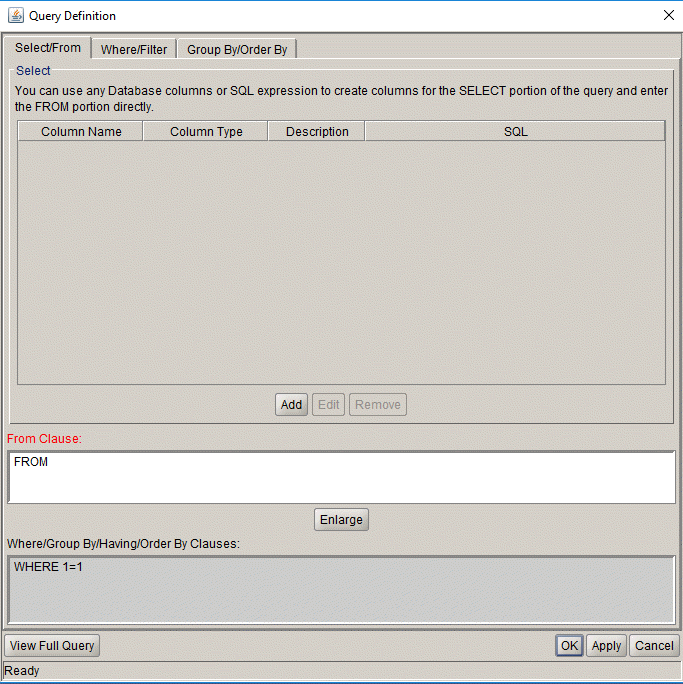 3. In the From Clause section of the Select/From tab of the Query Definition window, define the table from which the columns are selected.