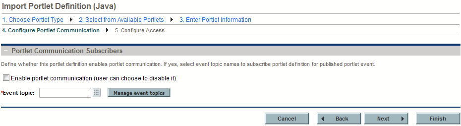 If you do not want to change any of the remaining default values, click Finish. Otherwise, click Next to go to Step 5: Configure Portlet Communication and configure the following:
