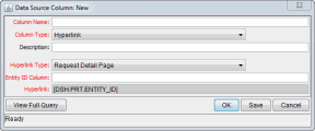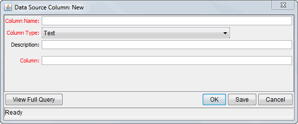 Adding columns to the Query Definition window relies on the Data Source Column window. The fields of the Data Source Column window vary, depending on the column type selected.
