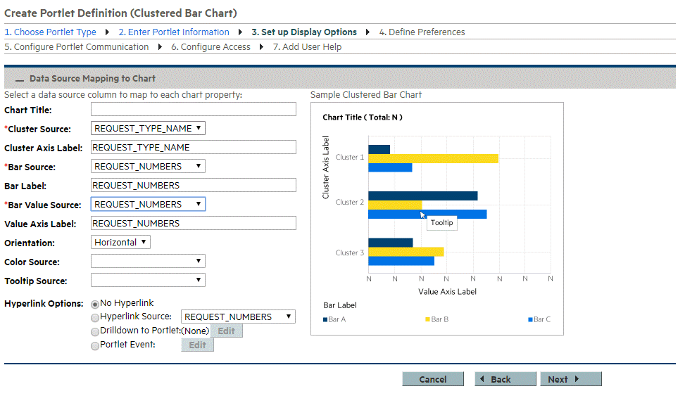 This topic provides details on how to set up display options for clustered bar chart portlet definitions.