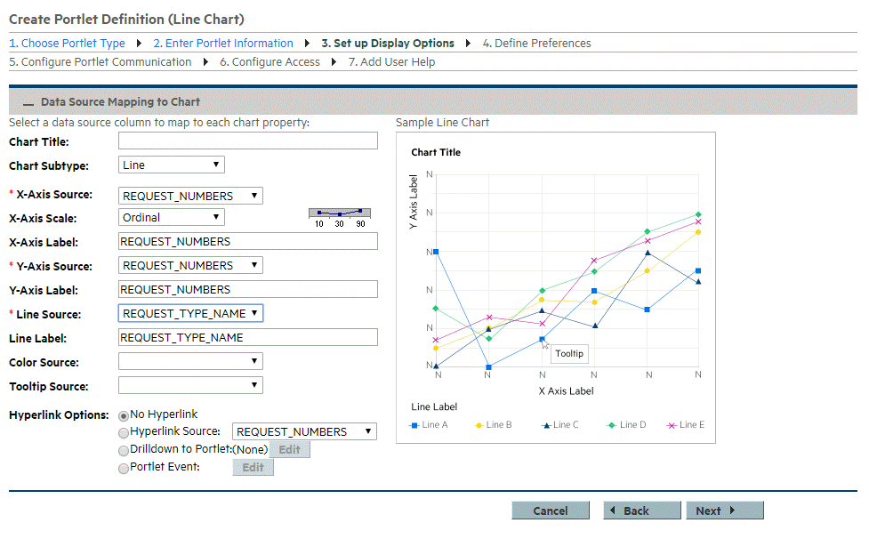 This topic provides details on how to set up display options for line chart portlet definitions.