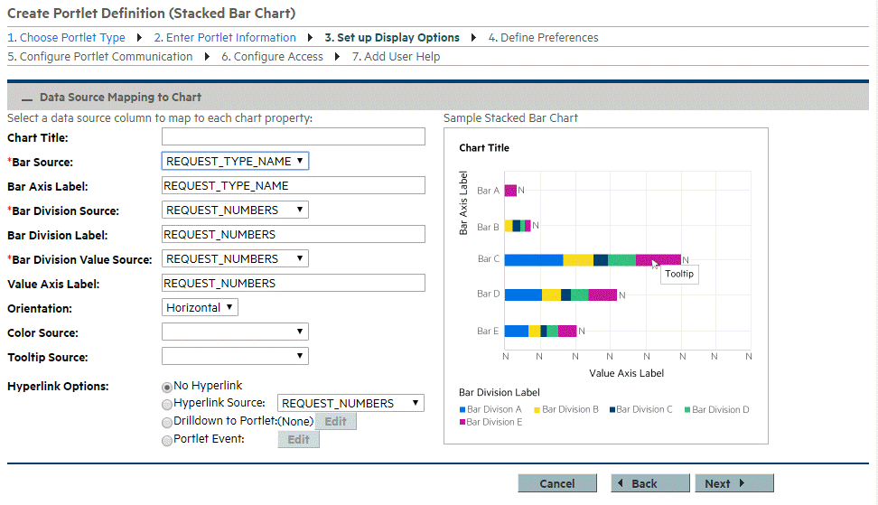 This topic provides details on how to set up display options for stacked bar chart portlet definitions.