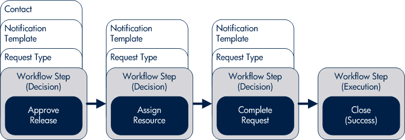 On the third step, Complete Request (a decision workflow step), the assigned resource fulfills the request. The request then moves to the fourth and, in this example, final step, Close (Success). This is an execution step at which the release process automatically closes and notifies users the release was successfully closed.