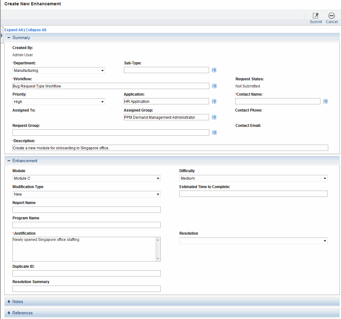 Each request type definition also specifies which request header type to use. The request header type defines sets of standard fields that are common to multiple request types. The request header type includes options for enabling integration with other OpenText products, both within the PPM product suite (Program Management, Project Management, and Portfolio Management) and outside of the suite (such as Universal Configuration Management Database, Quality Center, and Service Center).