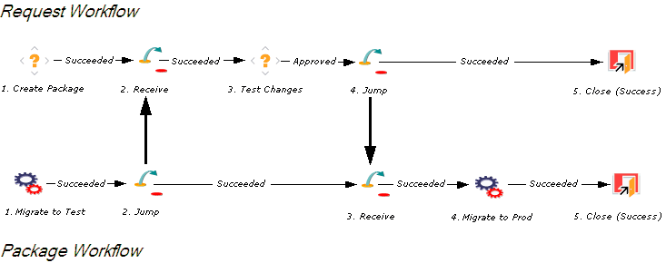 After the Approval step succeeds, the process jumps back to, and is received by, the request. The request then undergoes more testing and changes in the QA Environment.