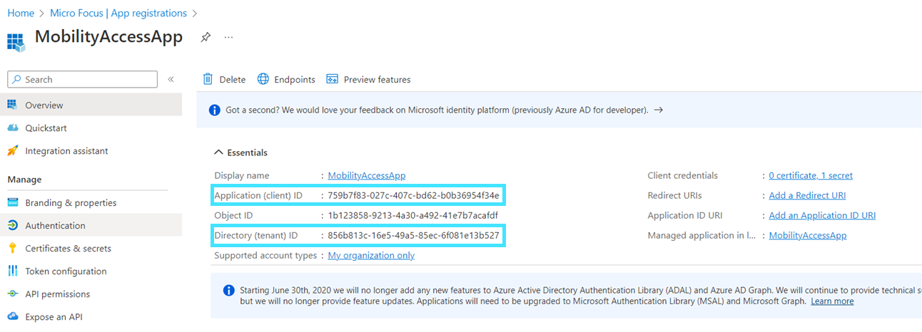 The Application (client) ID in Azure AD. You must register Mobility Access as an Azure AD application to obtain the information. For details, see Set up Mobility Access as an Azure AD application.