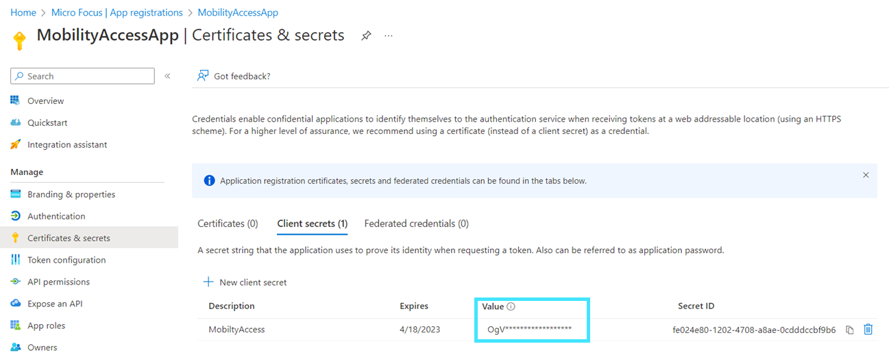 The secret value obtained from Azure AD. You must register Mobility Access as an Azure AD application and add a client secret for the application. For details, see Set up Mobility Access as an Azure AD application.