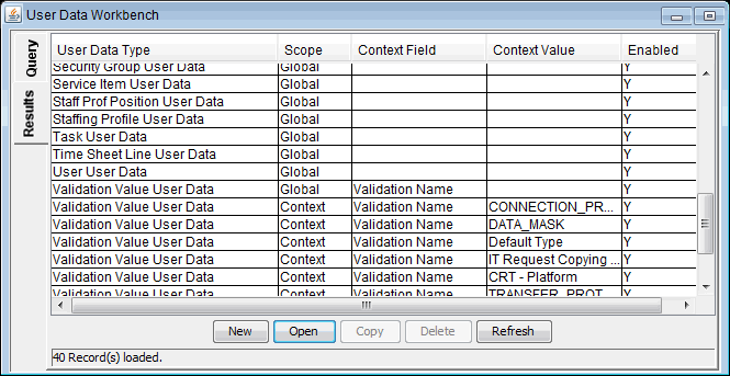 You configure user data types from the User Data Context window in the User Data Workbench. In Figure 10-1. User data types, the User Data Workbench Results tab lists some of the preconfigured user data types available.