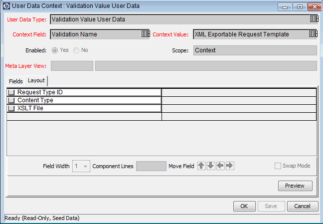 The layout of user data fields can be changed in the Layout tab of the User Data Context window.