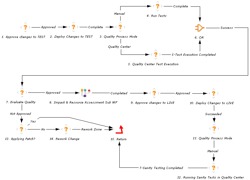 The OpenText Application Quality Management - Deploy and Test Changes Sub WF subworkflow provides a modular process for deploying and testing changes. The process can communicate automatically with Quality Center. If no integration exists, a manual process is also provided. Figure 3-10 shows the subworkflow. Table 3-7 lists the important steps in the subworkflow and the user roles associated with those steps.