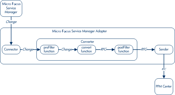 The converter also contains two optional filters to control which changes are imported into OpenText PPM. The preFilter filters out categories of changes you specify in the Service Manager data model before those changes are converted. After the Service Manager changes are converted to RFCs, the postFilter filters out categories of requests you specify before those requests are presented to the sender.