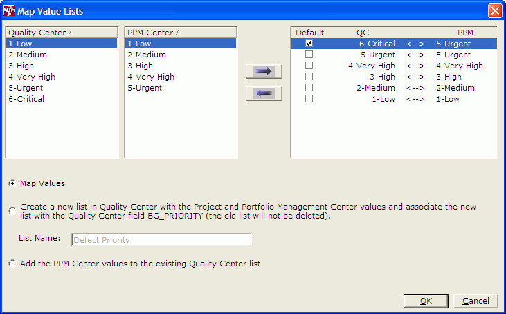 You must map all the values in the Quality Center list if Quality Center is dominant for that field pair, as indicated by QC in the Override column in the Map Fields window and by --> between the QC and PPM columns in the right pane of the Map Value Lists window.