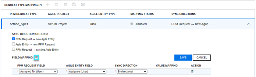 - The PPM request -> New Agile entity sync direction is enabled for the mapping.