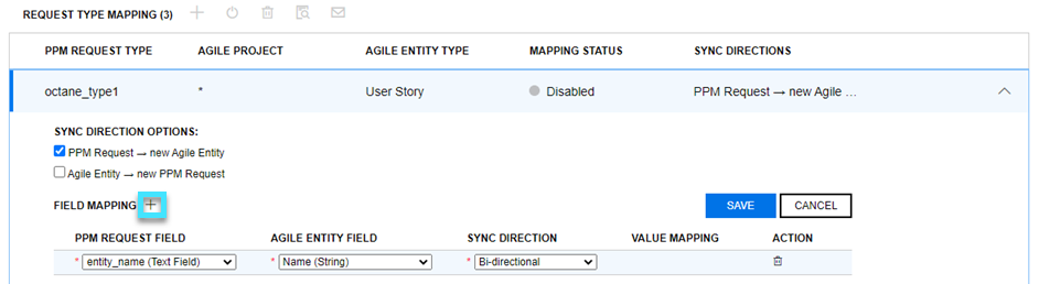 - The Agile entity -> New PPM request sync direction is enabled for the mapping. For details, see Map PPM request types to agile entity types.