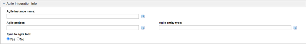 In the Create New <PPM_Request_Type> page, Agile Integration Info section, provide the following information.