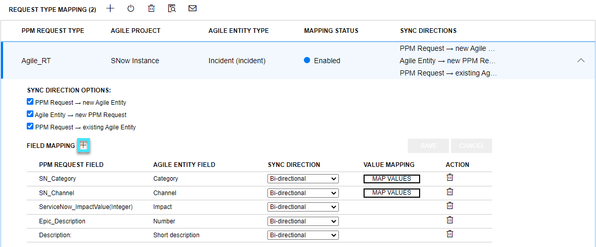 - The PPM request -> New Agile entity sync direction is enabled for the mapping.