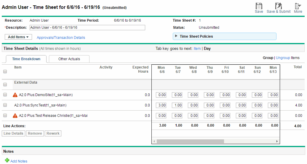 - Review and edit the time sheet lines if necessary.
