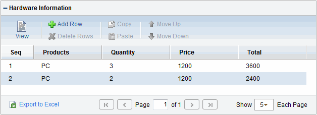 Table component can be used to store multiple records in a single field on a request. You can configure table component to include multiple columns of varied data types. You can also configure rules for populating elements within the table and enabling functionality for capturing column totals.