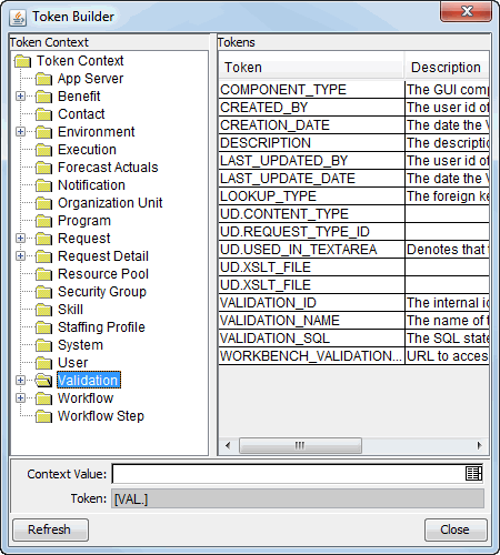 From each of the entity windows listed in Where to use tokens, you can open the Token Builder window (Figure 4-2. Token Builder window) to create a token. The tokens available in the token builder are limited to those that you can build for that entity. For example, if you open the token builder from the Request Type Workbench, package tokens are excluded.