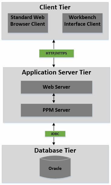 Browser clients use HTTP or HTTPS (HTTPS requires an external Web server) to communicate with the OpenText PPM Web and application servers. PPM Workbench clients (Java™ applet) use Remote Method Invocation (RMI). The following sections provide information about each tier.