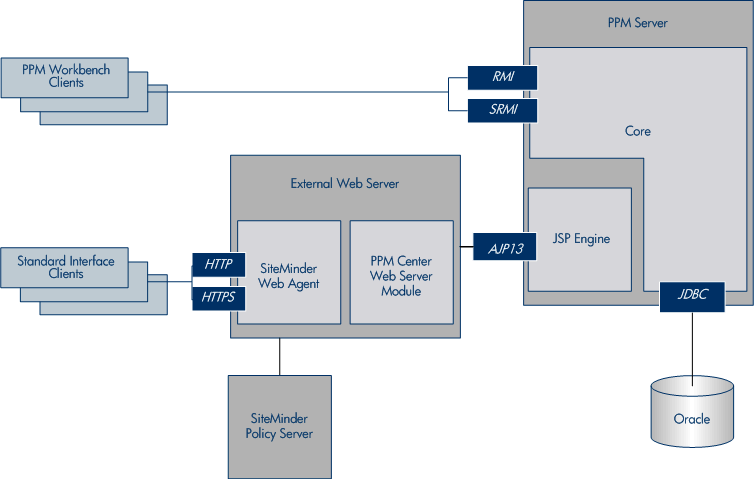 The SiteMinder Web Agent is the single access point for all Web clients. The SiteMinder Web Agent intercepts all incoming requests and ensures that they are authenticated before passing them to the OpenText PPM Web Server module. The requests then proceed to the PPM Server.