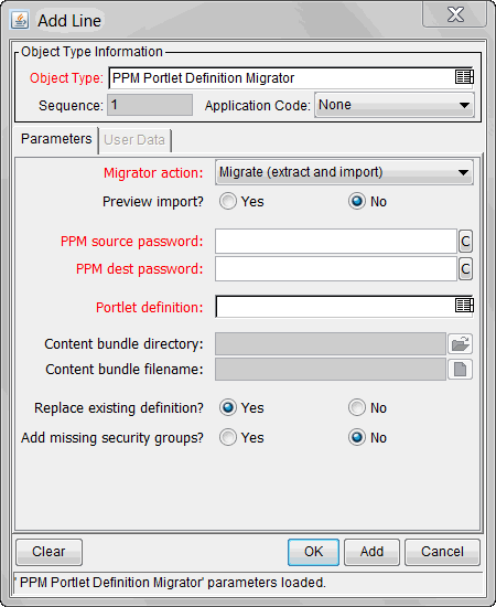 The Portlet Definition Migrator contains all standard entity migrator object type fields. If you migrate a portlet definition to replace an existing enabled portlet definition the destination instance of OpenText PPM, the migrated changes are applied to all users who have added the same portlet to their PPM Dashboard pages.