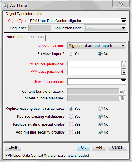 The User Data Context Migrator contains the additional option Replace Existing special cmds? If the validation to be migrated references OpenText PPM special commands that already exist in the target OpenText PPM instance, you can decide whether or not to replace them. This includes both parent and child special commands. (The default value is No.) Regardless of their values, OpenText PPM automatically re-creates special commands that are missing from the destination instance.
