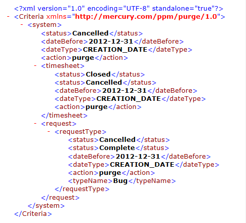 By clicking Download XML, you can download an XML file that contains all purge criteria that you or another DB administrator specified for that purge operation. You can find the XML file as follows: C:/Users/<User>/Downloads/purgeCriteria_<purge_ID>.xml. Below is the content of the XML file for purge ID 30020: