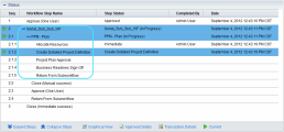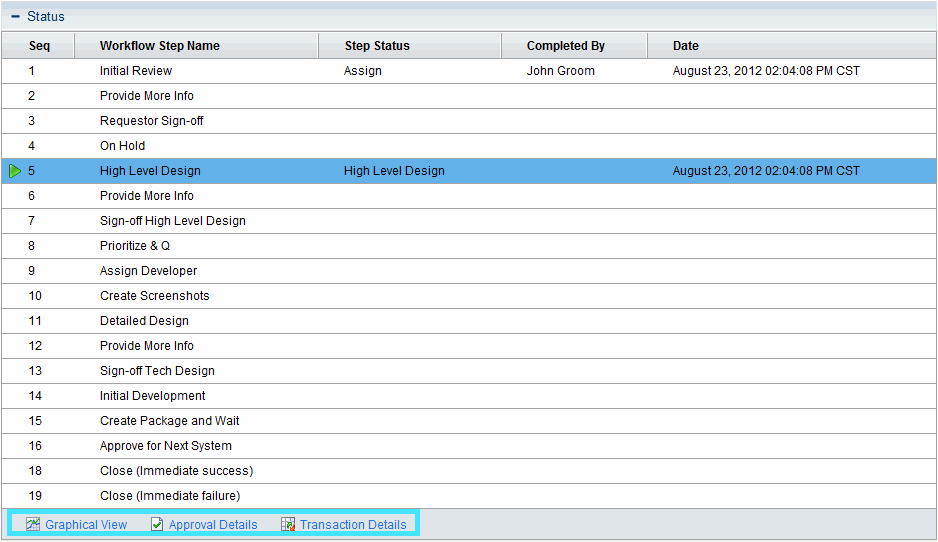 If a workflow step has been acted on, the status of the workflow step and the resource who completed the step are also listed. The active workflow step is highlighted.