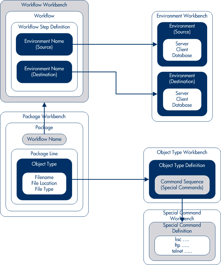 In Figure 2-3. How a package comes together , the package displayed in the Package Workbench is associated with a workflow in the Workflow Workbench. The migration workflow steps are configured with source and destination environments. You access and configure environments using the Environment Workbench.