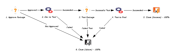 You must perform the Approve Package and Test Package workflow steps manually during the course of the workflow. You configure the Dev to Test and Test to Prod workflow steps to run automatically.