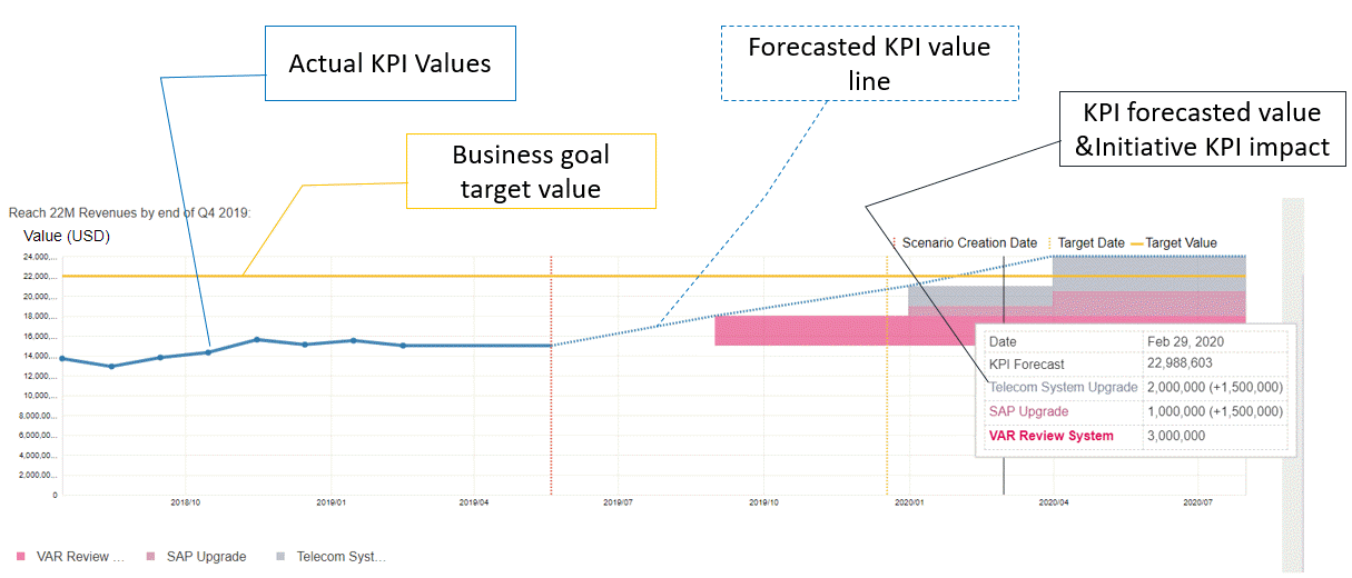 Will the portfolio hit the goals? Does it deliver maximum values? The KPI charts of each portfolio business goal in the business goal page > Strategy tab > KPIs Forecasting section help you make reasonable forecasting about business values.
