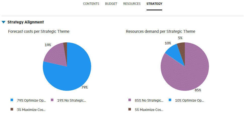 Are budget and resources aligned with strategic themes? The Forecast costs and Resources demand pie chats in the Strategy in Portfolio section of a strategic theme details page help you get the answer to this question.