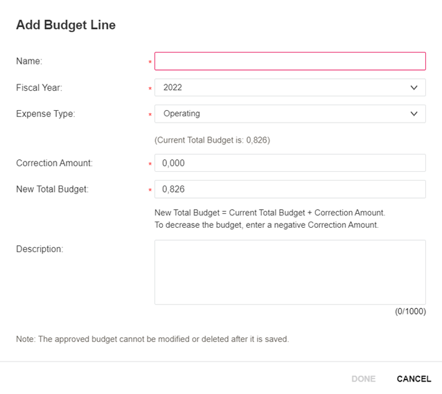 false, you cannot enter decimals in the Correction Amount or the New Total Budget field. That is, you can only provide an amount by integral multiple of 1000. For details, see Configure numeric display. - Click Done.
