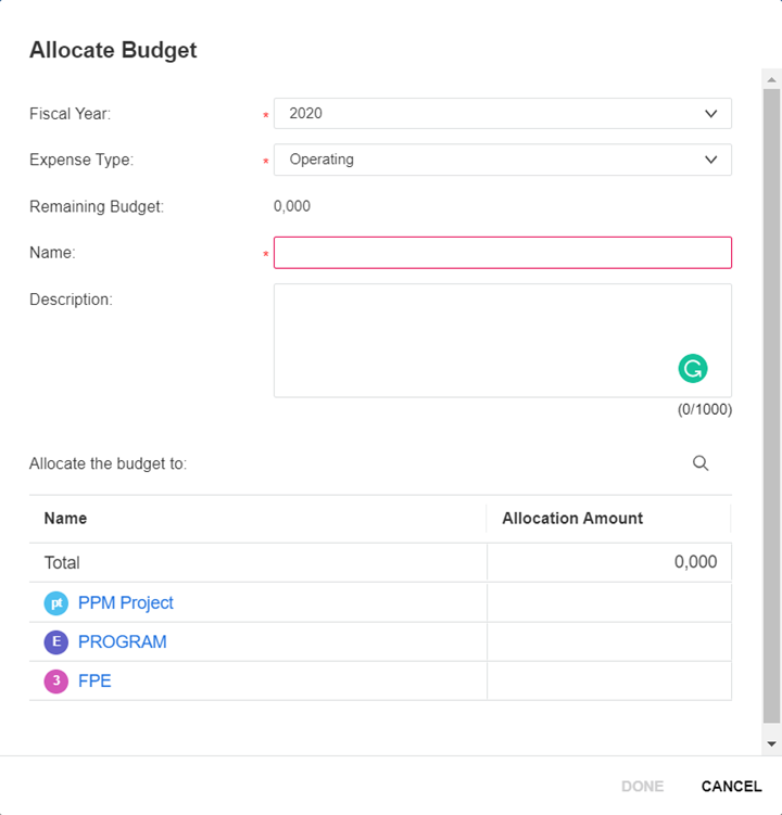 false, you cannot enter decimals in the Allocation Amount field. That is, you can only provide an amount by integral multiple of 1000. For details, see Configure numeric display. - Click Done.