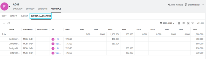 - You can filter, group, and sort the budget. For details, see Financials UI elements.