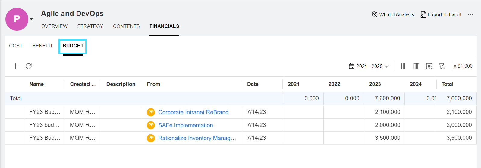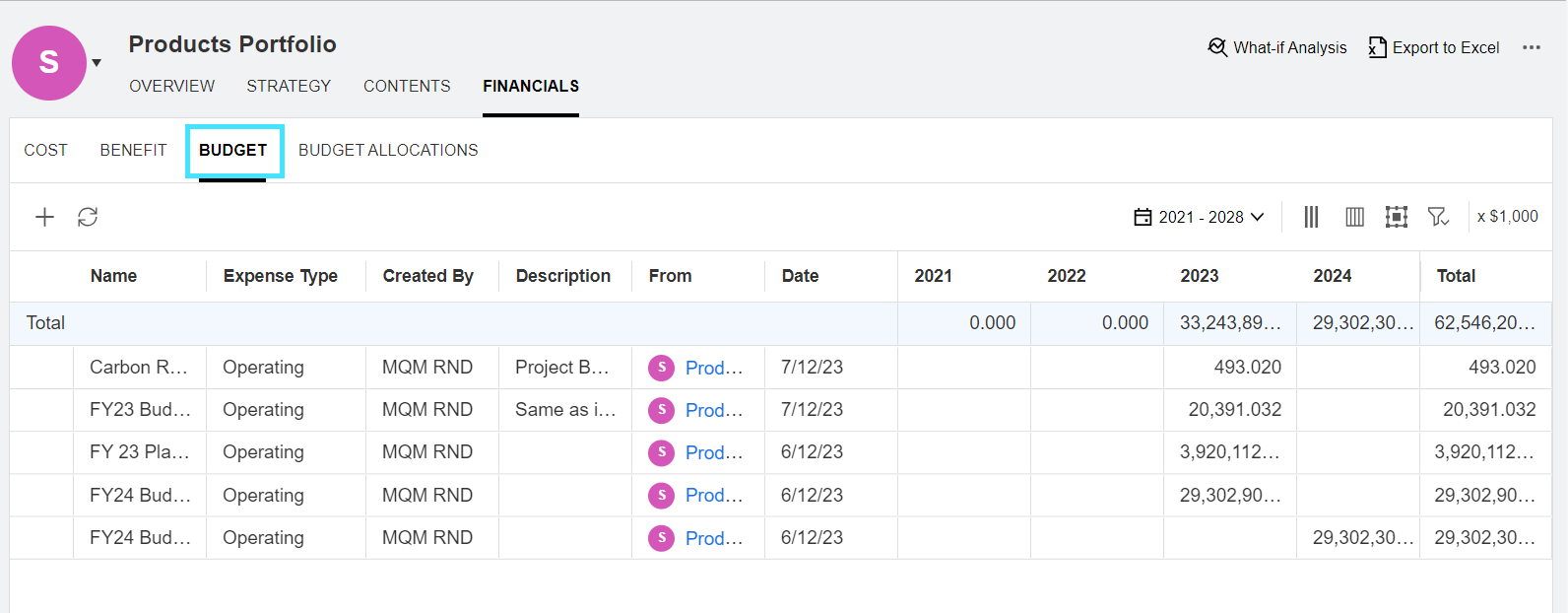 Rolled up from a program's contents To learn from which portfolio content the budget comes, see the From column.