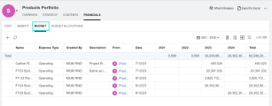 The Budget tab displays budget rolled up from portfolio contents, added at the portfolio level, and received from the parent portfolio (if exists). The name of the budget line varies depending on where the budget comes from.