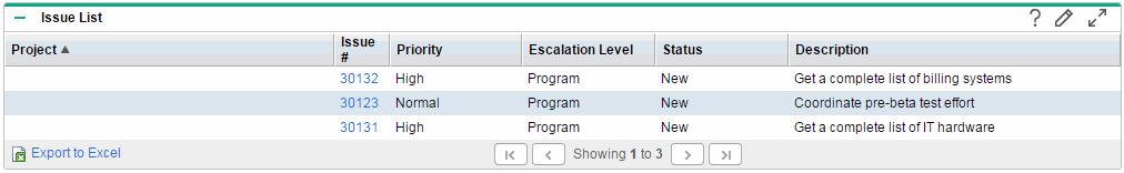The Issue List portlet lists all the issues that are directly associated with a selected program. You can display multiple instances of this portlet on a page so that you can view several programs and their associated issues at the same time.