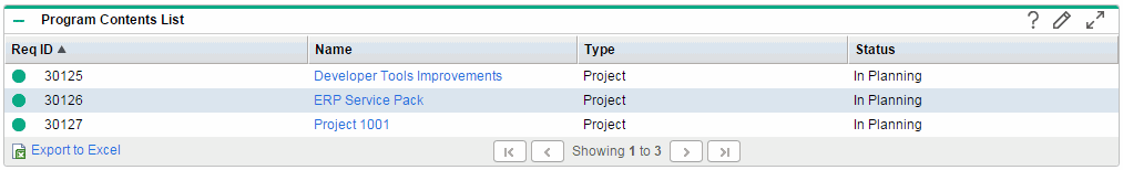 The Program Contents List portlet provides a view into all the projects associated with a program and their respective health indicators. This portlet can have multiple instances for viewing different programs and their associated projects. You can select which projects the portlet displays based on a number of specified criteria, including project name, status, and health.