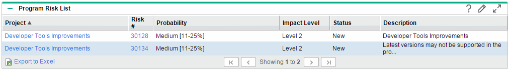The Program Risk List portlet lists all of the risks associated with a selected program. You can display multiple instances of this portlet on a page so that you can view several programs and their associated risks at the same time.