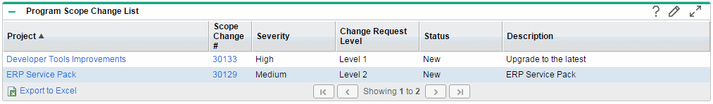 The Program Scope Change List portlet lists all the scope changes associated with a given program. You can display multiple instances of this portlet on a single page so that you can view several programs and their associated scope changes at the same time.