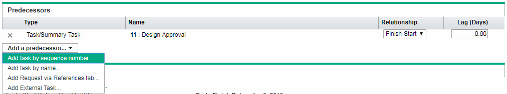 You can also define lag or lead time for predecessor relationships by typing a positive or negative number in the Lag (Days) field, if desired. When adding a summary task as a predecessor, only relationships of the Finish-Start or Finish-Finish type are allowed. When adding a predecessor to a summary task, only relationships of the Finish-Start or Start-Start type are allowed. |