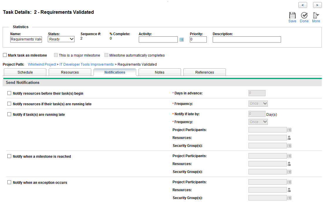 You can set up notifications for a task to specify when and to whom to send emails during the project execution.