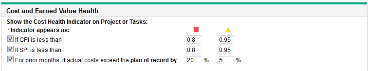 For a healthy project, CPI should be near 1. Specify the threshold value of the red and yellow indicators. CPI values less than the threshold values turn the health indicator to red or yellow. |