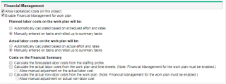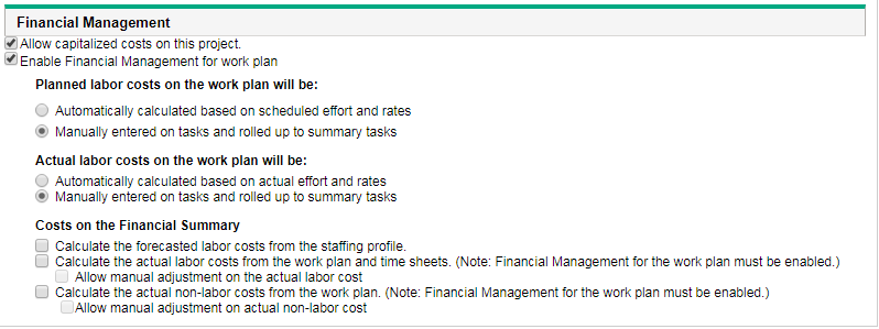 This section controls whether or not to enable Financial Management for the project work plan and, if enabled, how planned and actual work plan cost is calculated in task details and project financial summary.