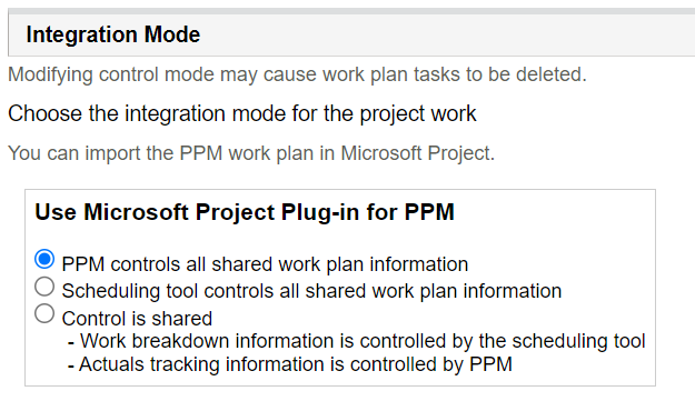 You can either upload and download work plan files from PPM or use the Microsoft Project plug-in for the integration.