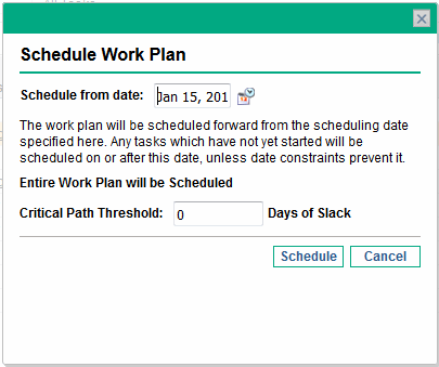 When you schedule a work plan or a summary task, you schedule all the tasks of the work plan or all the child tasks of the summary task forward from a start date. When the scheduler runs, it considers the scheduling constraints of each task and task dependency between tasks.