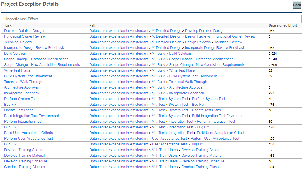 Clicking a specific exception type link, for example, the Unassigned Effort link, all the tasks that have violated the corresponding exception rule are listed. In this case, the exception rule is: Some effort is unassigned and the scheduled start date occurs in xx days.